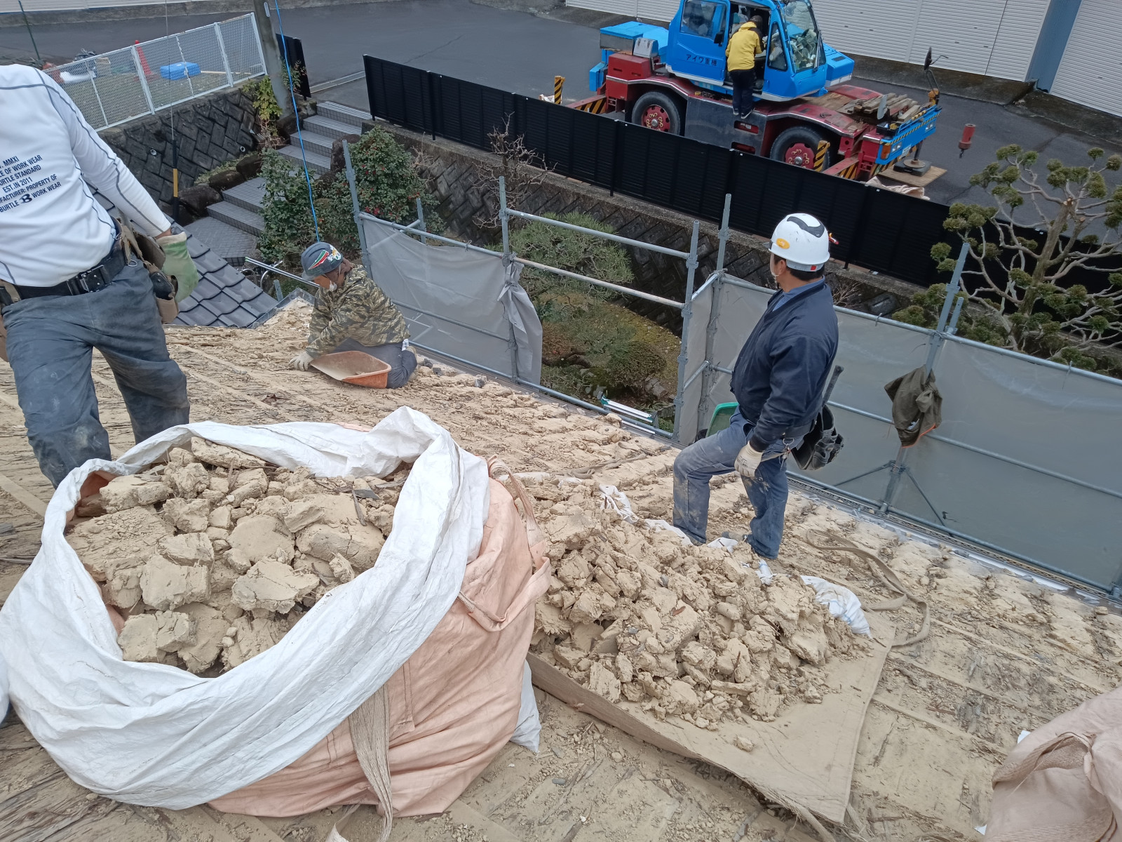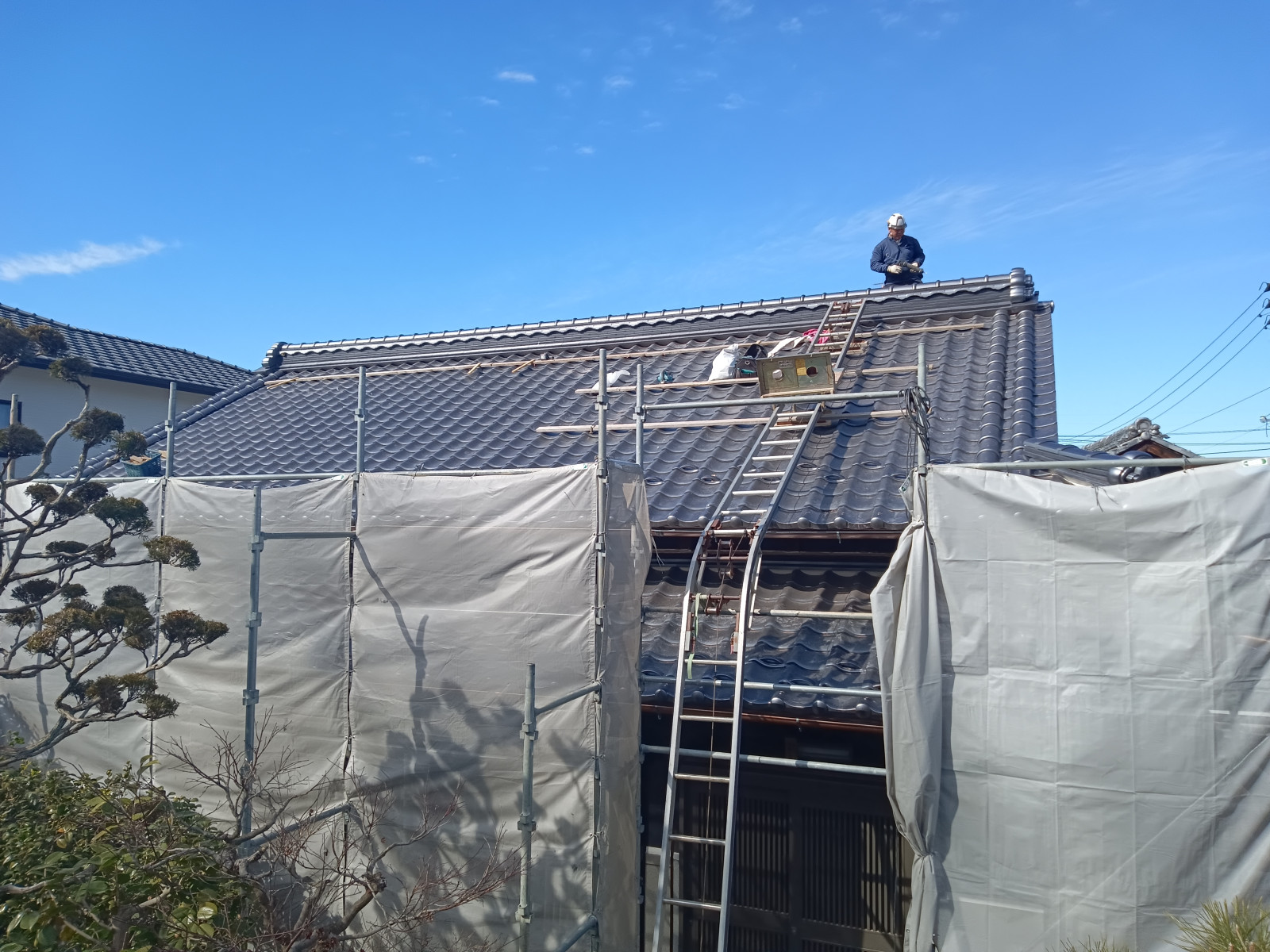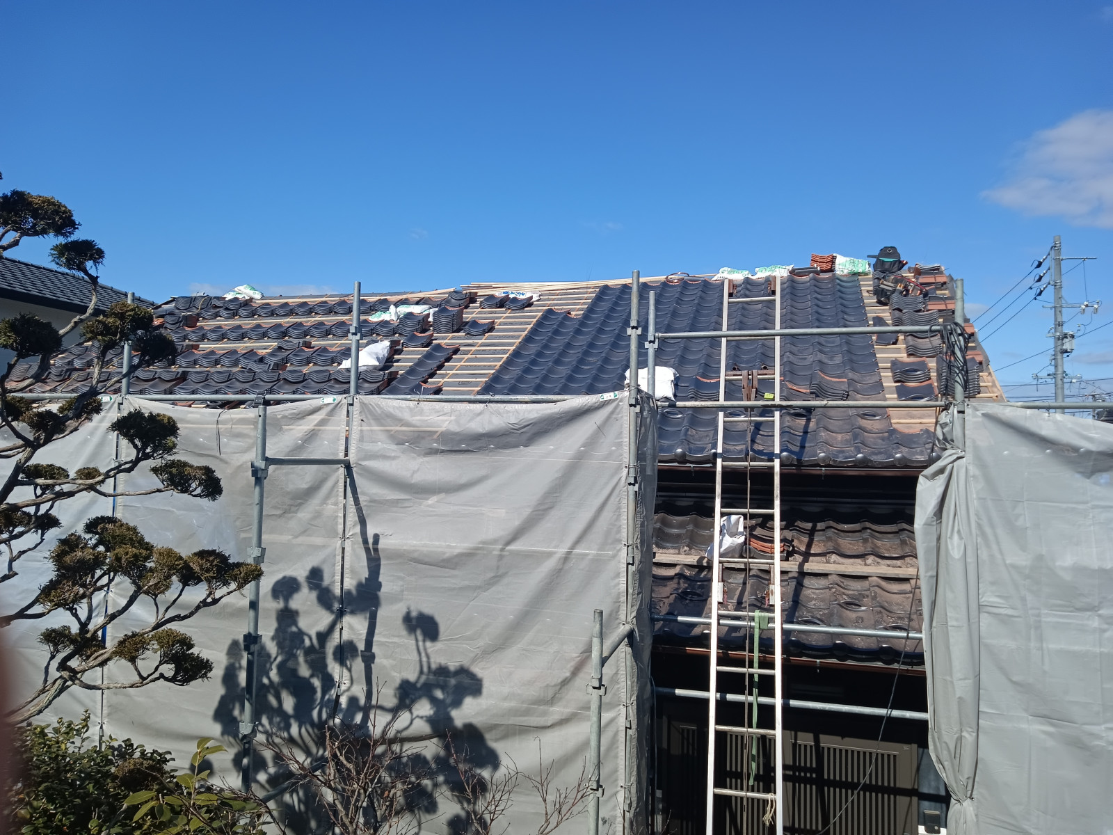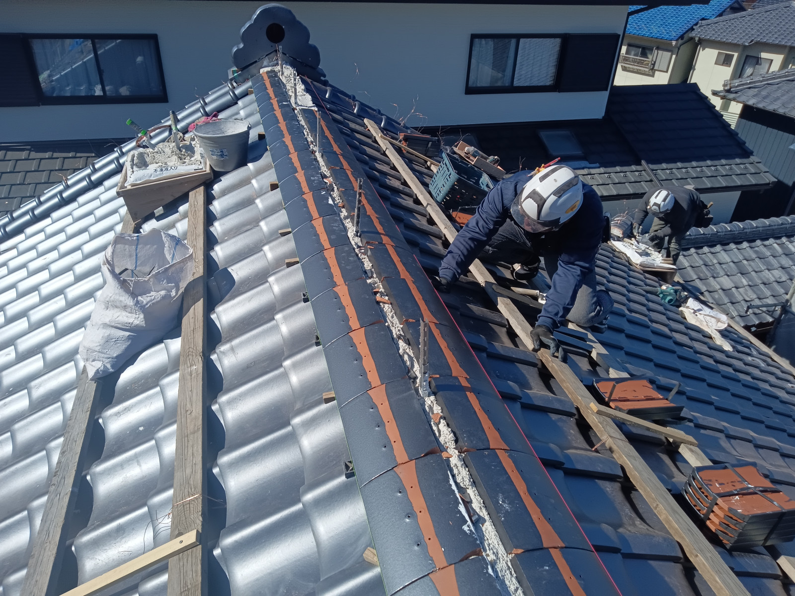 施工事例|いぶし瓦から三州陶器瓦への工事 2024/10/22 事例紹介CASE いぶし瓦から三州陶器瓦への葺替工事 施工前 施工後 【多治見市 M様邸】屋根が重いという事で色々見積させていただきましたが、和型がよいとのことで変更がない三州陶器瓦の銀りんになりました。土がのっていないのと、瓦屋根標準設計・施工ガイドラインの施工をしているので安心です。 工事の途中経過写真 土がてんこ盛り! 瓦めくり コンパネ ルーフィング施工 瓦棒打ち 軒から 瓦葺き 棟部施工 ヒボ丸施工 完成です