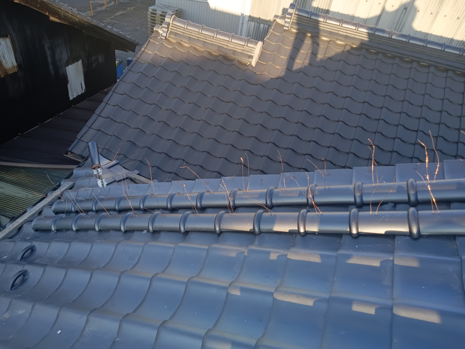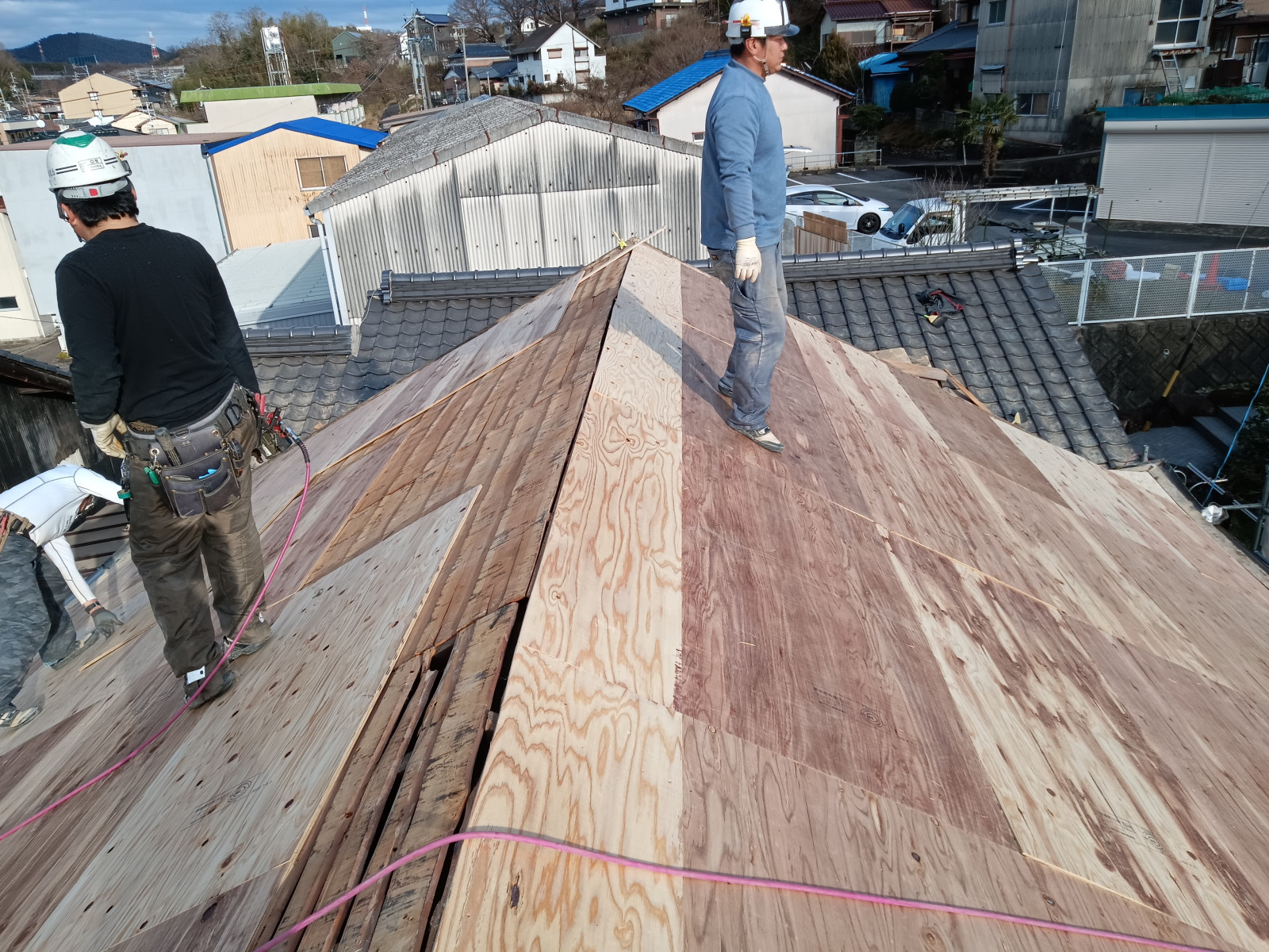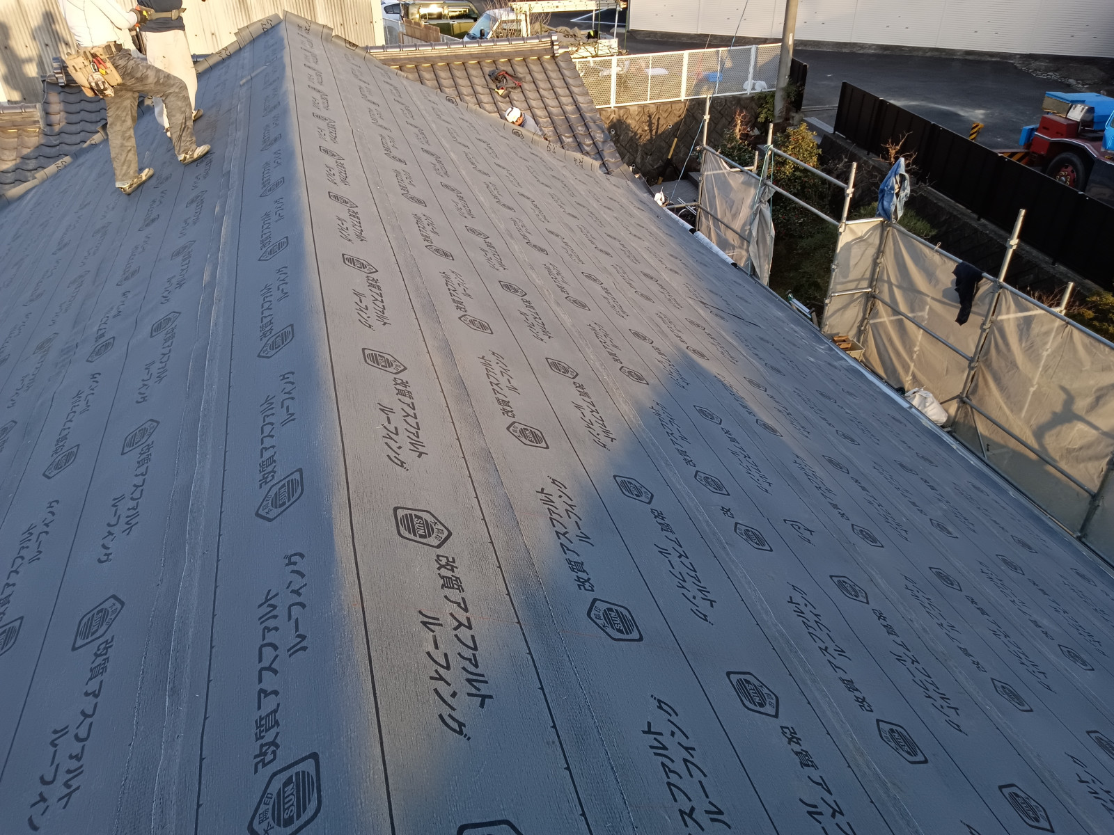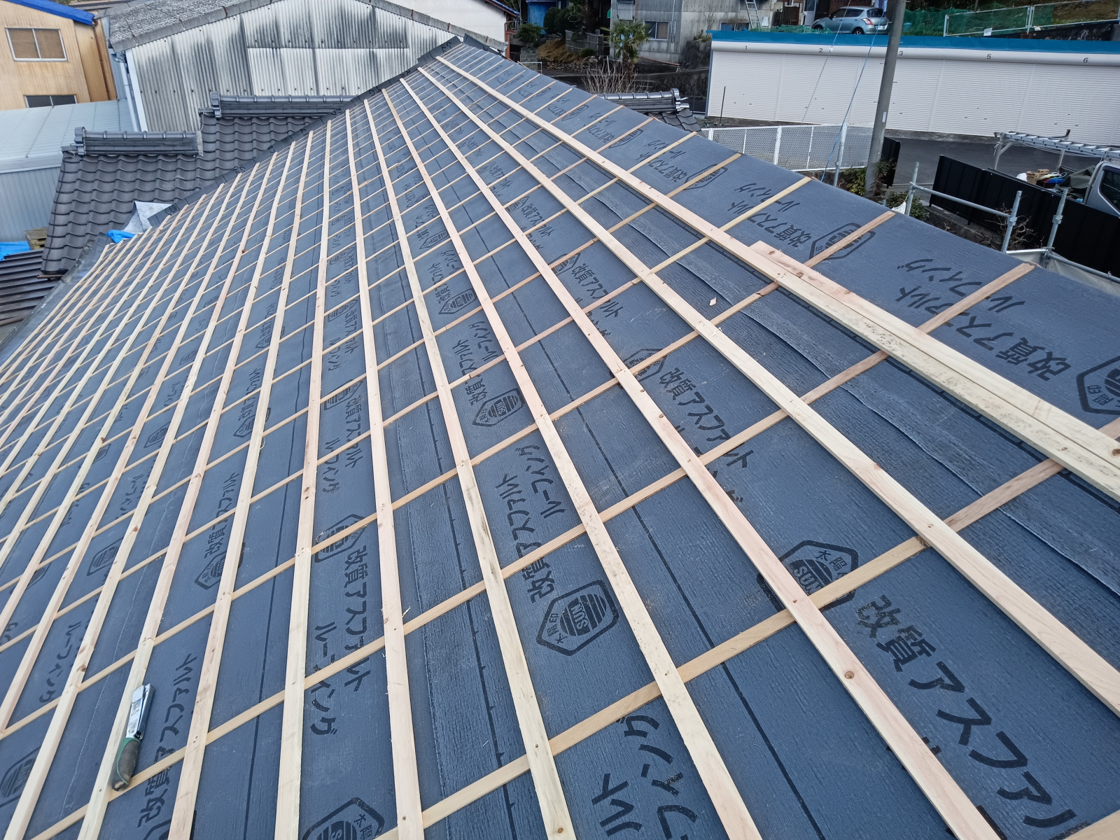 施工事例|いぶし瓦から三州陶器瓦への工事 2024/10/22 事例紹介CASE いぶし瓦から三州陶器瓦への葺替工事 施工前 施工後 【多治見市 M様邸】屋根が重いという事で色々見積させていただきましたが、和型がよいとのことで変更がない三州陶器瓦の銀りんになりました。土がのっていないのと、瓦屋根標準設計・施工ガイドラインの施工をしているので安心です。 工事の途中経過写真 土がてんこ盛り! 瓦めくり コンパネ ルーフィング施工 瓦棒打ち 軒から 瓦葺き 棟部施工 ヒボ丸施工 完成です